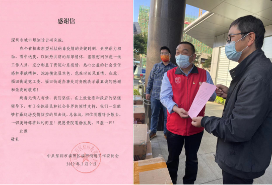 随着本轮深圳疫情的暴发,福田区成为重灾区,许多医护人员、工作人员与志愿者奋战在抗疫一线,政府投入了大量人力物力,压力巨大。而福田区作为深规院的发祥之地,也是很多深规人工作和生活的家园,支持福田战疫也有我们的一份责任。为此,院党委班子积极响应政府的号召,迅速动员组织我院员工投身一线抗疫工作。同时,在单樑、刘龙胜、韩刚团三位福田政协委员的倡议下,院领导带头捐款,深规人慷慨解囊,为一线抗疫人员送去一份春天的心意,仅一天时间就筹得善款83396元,彰显了深规人共战疫情的决心。3月9日下午,区委统战部王妃燕常务副部长亲自出席福田街道办事处举行的爱心捐赠仪式,院党委副书记陈敏及单樑、刘龙胜、韩刚团三位福田政协委员作为捐赠方代表参与活动,仪式上福田街道党工委委员虞乔琼对深规院员工的善举表示真挚的感谢,并递交了感谢信。
