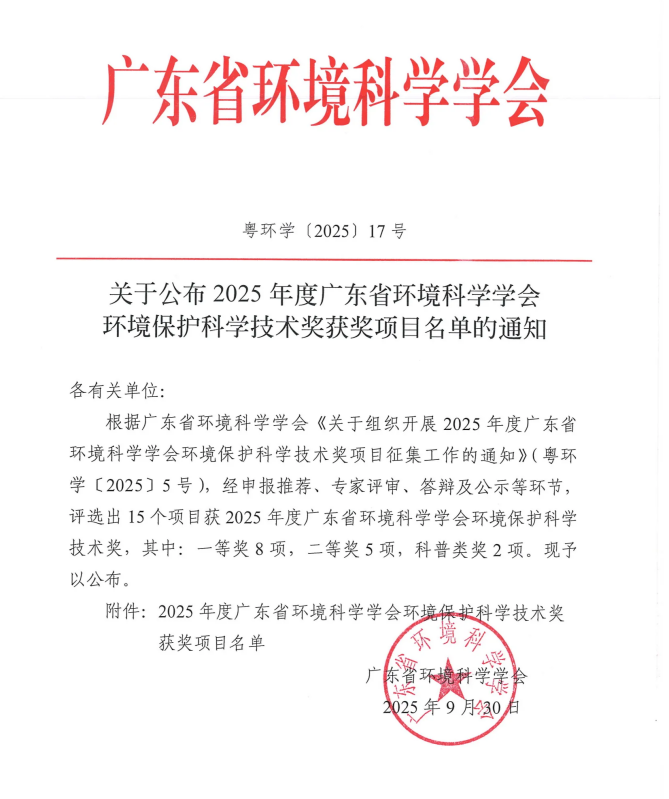 广东省环境保护科学技术奖,是由广东省环境科学学会为推动广东省生态环境科学技术发展,鼓励企业科技创新,扶持在生态环境科学技术研究工作中做出突出贡献的单位和个人,而设立的环境保护领域内重要的省级奖项。根据广东省环境科学学会《关于组织开展2025年度广东省环境科学学会环境保护科学技术奖项目征集工作的通知》(粤环学〔2025〕5号),经申报推荐、专家评审、答辩及公示等环节,评选出15个项目获2025年度广东省环境科学学会环境保护科学技术奖,其中:一等奖8项,二等奖5项,科普类奖2项。