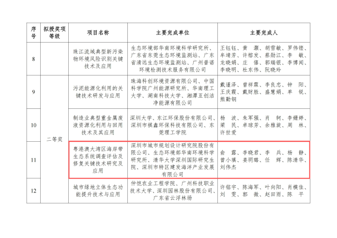 该项目根据粤港澳大湾区海岸带开发利用特征,基于海岸带生态保护修复的系统化工作要求,建立了一套集成生物多样性调查与评估、数据平台构建、规划设计方案制定、风险管控、效果评估为一体的海岸带生态系统调查评估及修复关键技术,该项技术授权了10项专利,其中8项发明专利;4项软著,3本专著,10篇论文。该项技术成果已应用于粤港澳大湾区多个生态修复项目,获国内外科学技术奖及规划设计奖项8项,推动海岸带调查从单一监测向"评估-修复-管控"全链条技术升级,取得了显著的社会效益和经济效益。