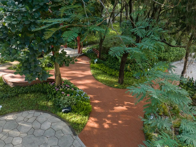生生花园位于深圳市北师大南山附属中学,总面积约500平方米。花园原址为学校生物园。设计概念以“生物细胞”为主题,旨在探索生长与生命延续,因此得名“生生花园”。为满足校园生态教学目标,融合科普知识、自然疗愈功能与校园文化,构建“自然疗愈+科普教育+校园文化”一体的校园绿色空间。花园运用红砖元素与植物巧妙结合,打造林下小游园、休憩区、自然疗愈区、户外课堂区、互动交流区及科普展示区,营造了优美校园景观,满足师生需求。